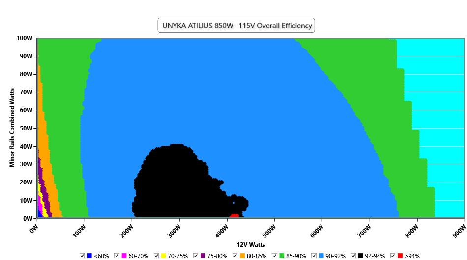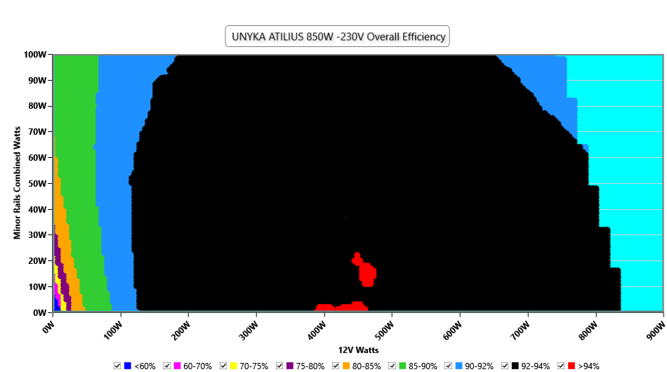 This graph depicts the PSU`s efficiency throughout its entire operational range. For the generation of the efficiency and noise graphs we set our loaders to auto mode through our custom-made software before trying thousands of possible load combinations