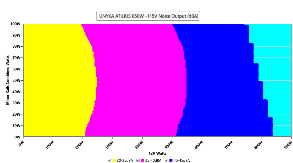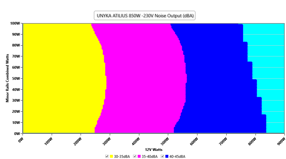 The PSU`s noise in its entire operational range and under 30-32 °C ambient is depicted in this graph. The X axis represents the load on the +12V rail(s) while the Y axis is the load on the minor rails