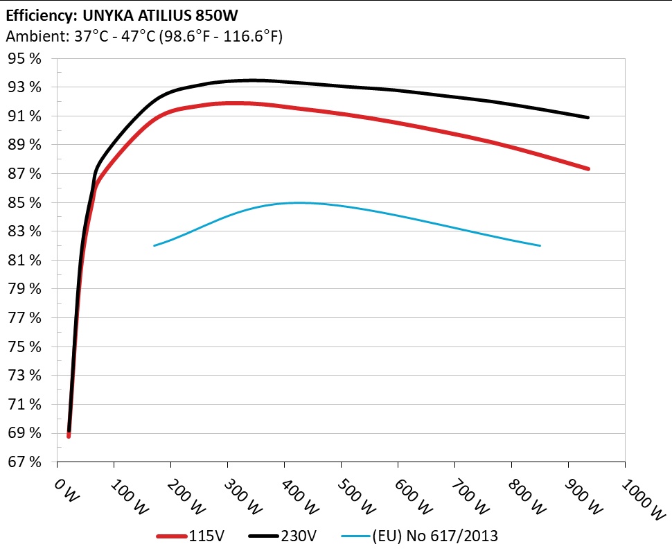 The PSU`s efficiency under high ambient temperatures with 115V and 230V input. For this graph the results of the 10-110% load regulation table are used