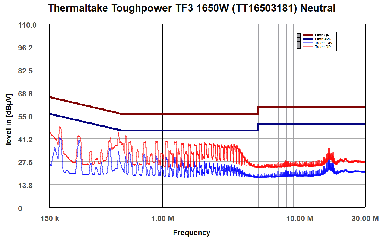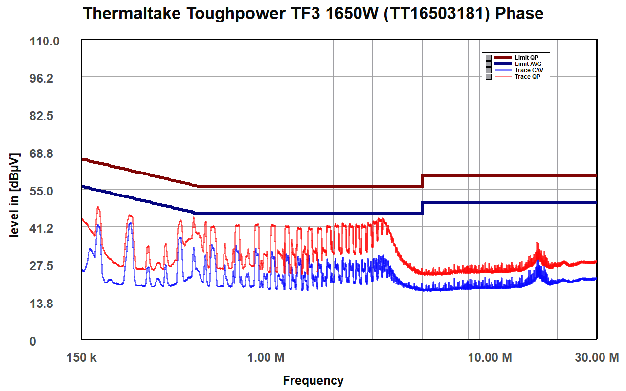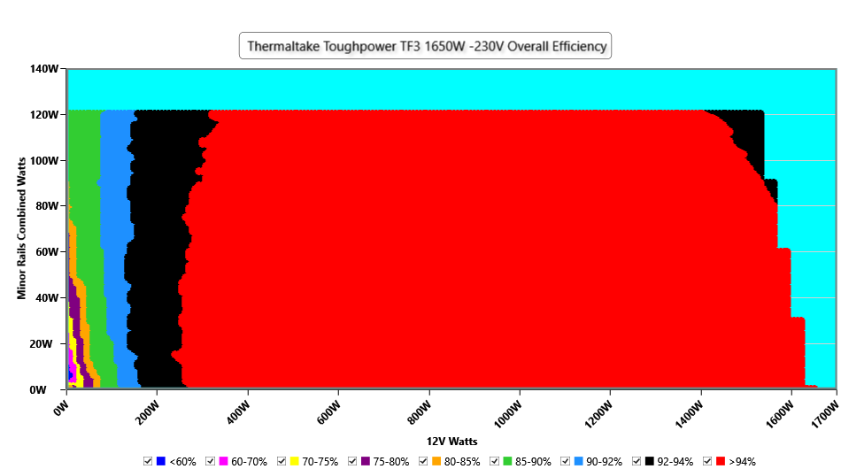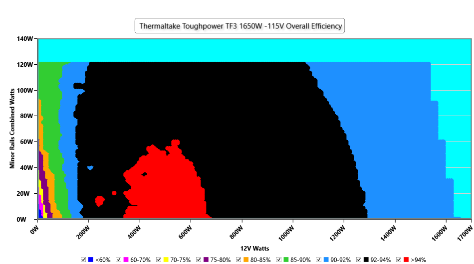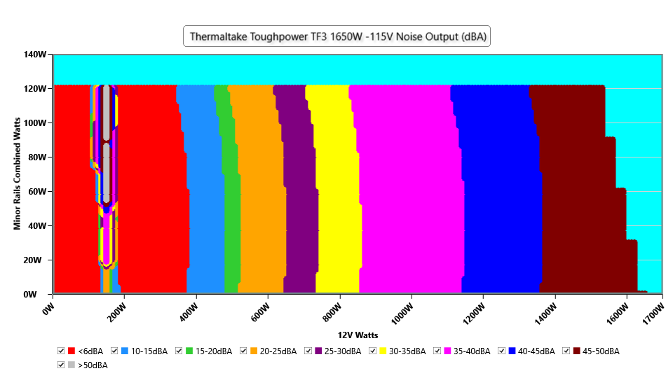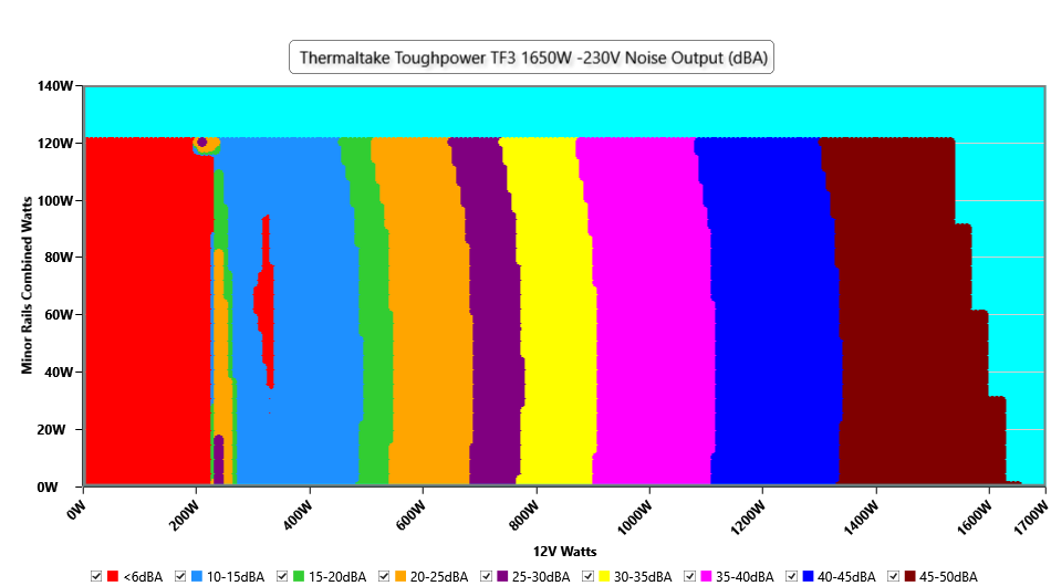 This graph depicts the PSU`s efficiency throughout its entire operational range. For the generation of the efficiency and noise graphs we set our loaders to auto mode through our custom-made software before trying thousands of possible load combinations