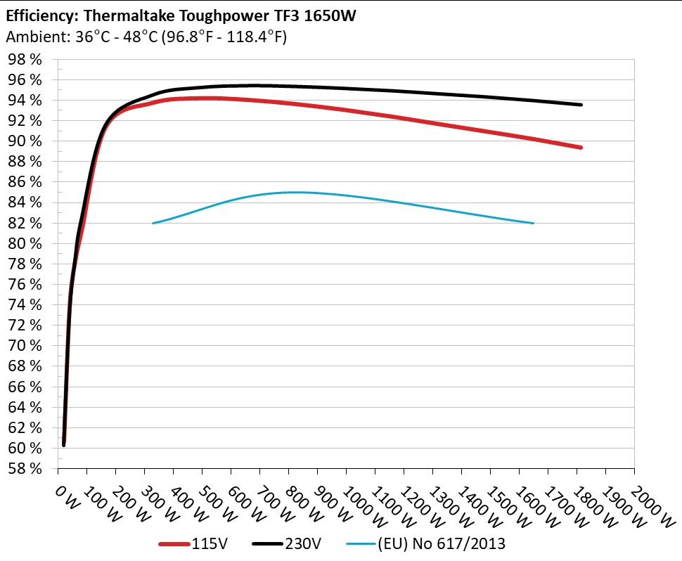 The PSU`s efficiency under high ambient temperatures with 115V and 230V input. For this graph the results of the 10-110% load regulation table are used