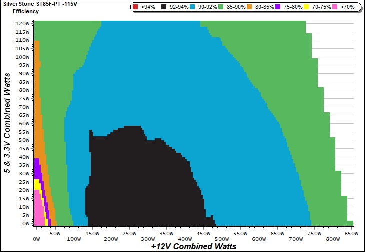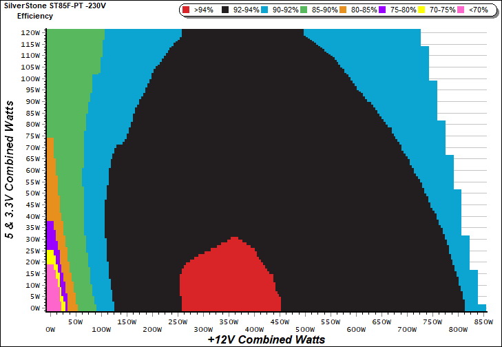 This graph depicts the PSU`s efficiency throughout its entire operational range. For the generation of the efficiency and noise graphs we set our loaders to auto mode through our custom-made software before trying thousands of possible load combinations.