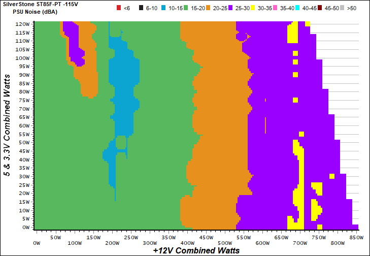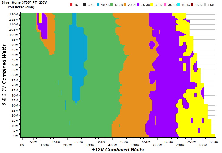 The PSU`s noise in its entire operational range and under 30-32 °C ambient is depicted in this graph. The X axis represents the load on the +12V rail(s) while the Y axis is the load on the minor rails.