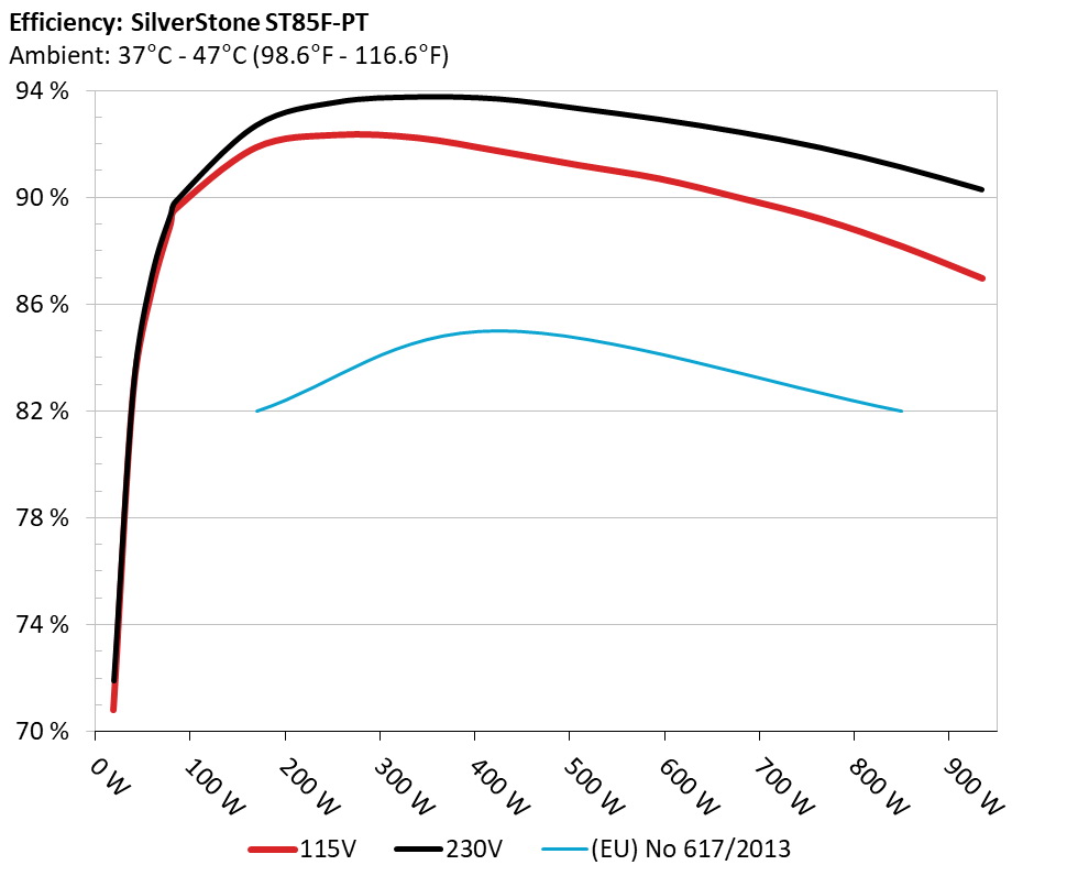 The PSU`s efficiency under high ambient temperatures with 115V and 230V input. For this graph the results of the 10-110% load regulation table are used.