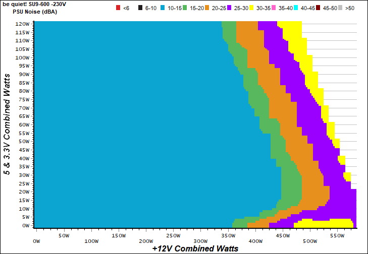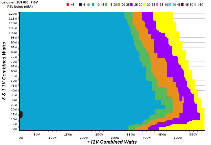 The PSU`s noise in its entire operational range and under 30-32 °C ambient is depicted in this graph. The X axis represents the load on the +12V rail(s) while the Y axis is the load on the minor rails.