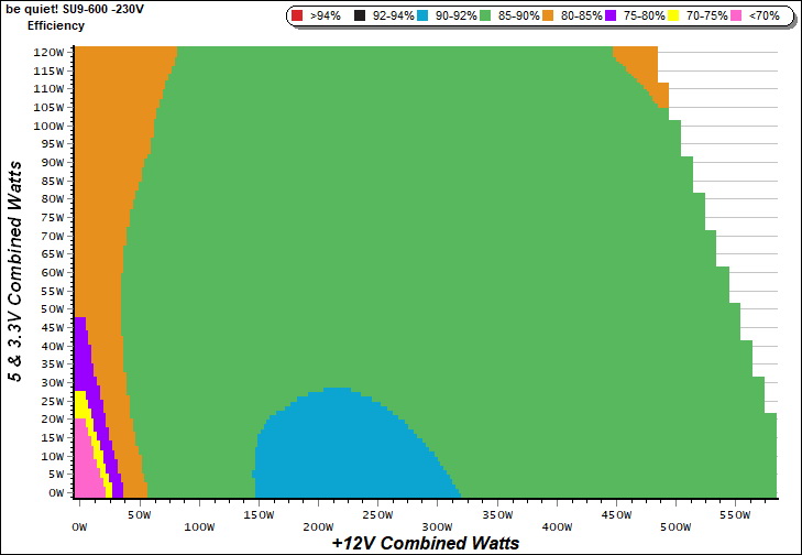 This graph depicts the PSU`s efficiency throughout its entire operational range. For the generation of the efficiency and noise graphs we set our loaders to auto mode through our custom-made software before trying thousands of possible load combinations.