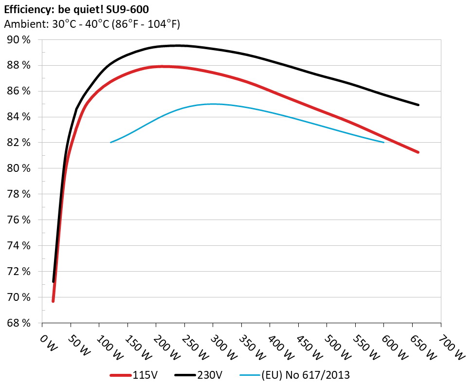 The PSU`s efficiency under high ambient temperatures with 115V and 230V input. For this graph the results of the 10-110% load regulation table are used.