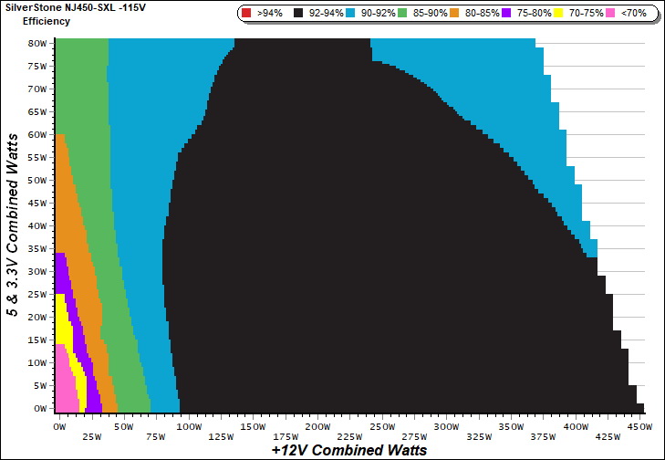 This graph depicts the PSU`s efficiency throughout its entire operational range. For the generation of the efficiency and noise graphs we set our loaders to auto mode through our custom-made software before trying thousands of possible load combinations.