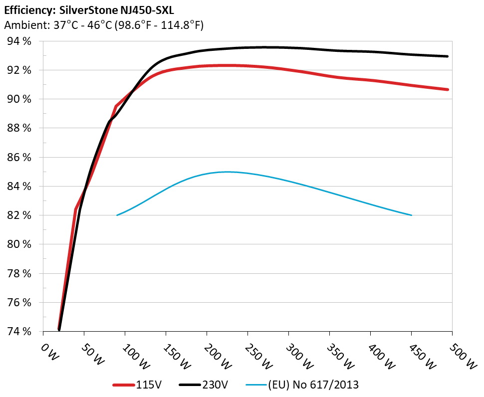 The PSU`s efficiency under high ambient temperatures with 115V and 230V input. For this graph the results of the 10-110% load regulation table are used.
