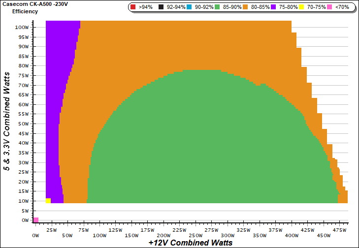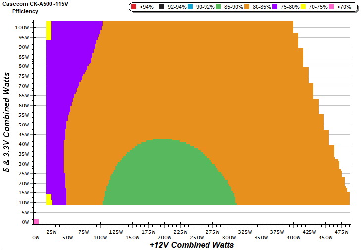 This graph depicts the PSU`s efficiency throughout its entire operational range. For the generation of the efficiency and noise graphs we set our loaders to auto mode through our custom-made software before trying thousands of possible load combinations.