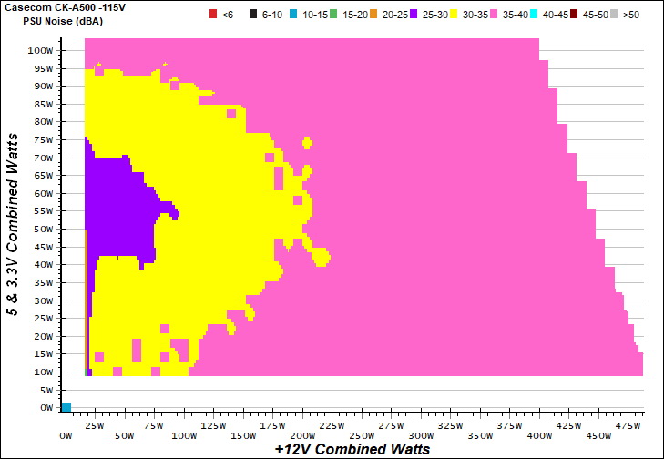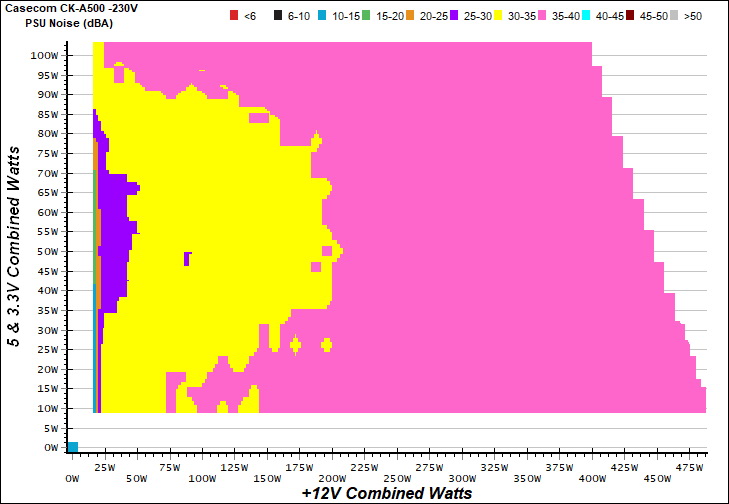 The PSU`s noise in its entire operational range and under 30-32 °C ambient is depicted in this graph. The X axis represents the load on the +12V rail(s) while the Y axis is the load on the minor rails.