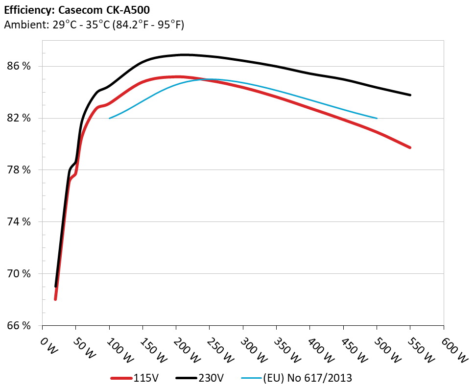 The PSU`s efficiency under high ambient temperatures with 115V and 230V input. For this graph the results of the 10-110% load regulation table are used.