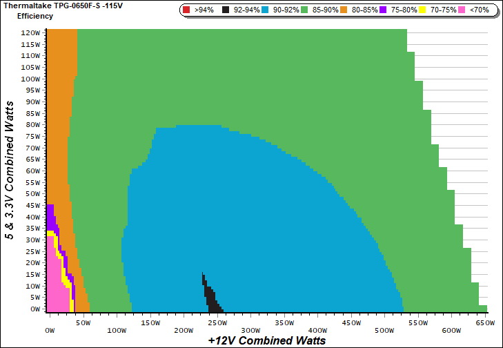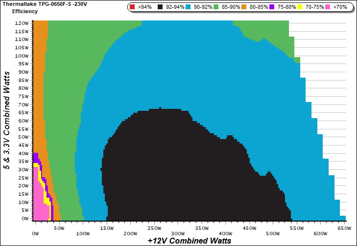 This graph depicts the PSU`s efficiency throughout its entire operational range. For the generation of the efficiency and noise graphs we set our loaders to auto mode through our custom-made software before trying thousands of possible load combinations.