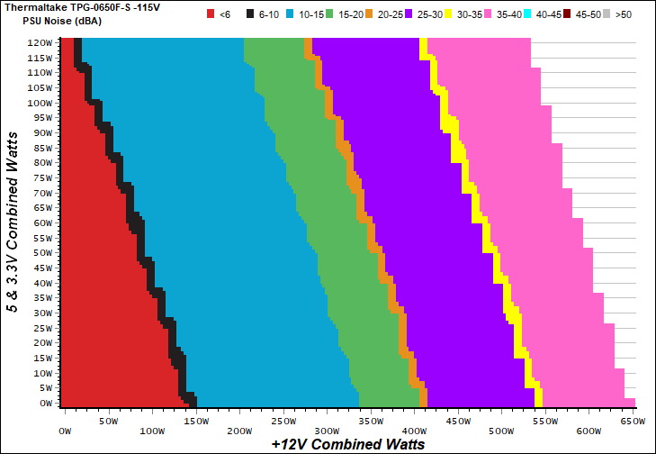 The PSU`s noise in its entire operational range and under 30-32 °C ambient is depicted in this graph. The X axis represents the load on the +12V rail(s) while the Y axis is the load on the minor rails.