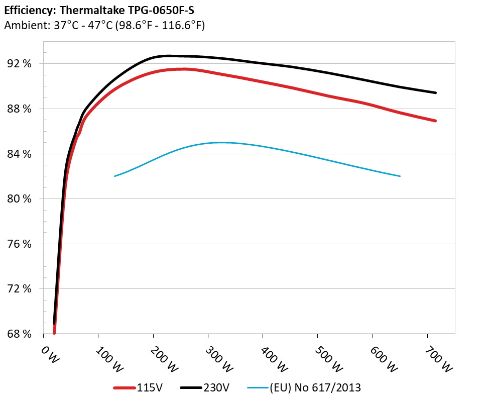 The PSU`s efficiency under high ambient temperatures with 115V and 230V input. For this graph the results of the 10-110% load regulation table are used.