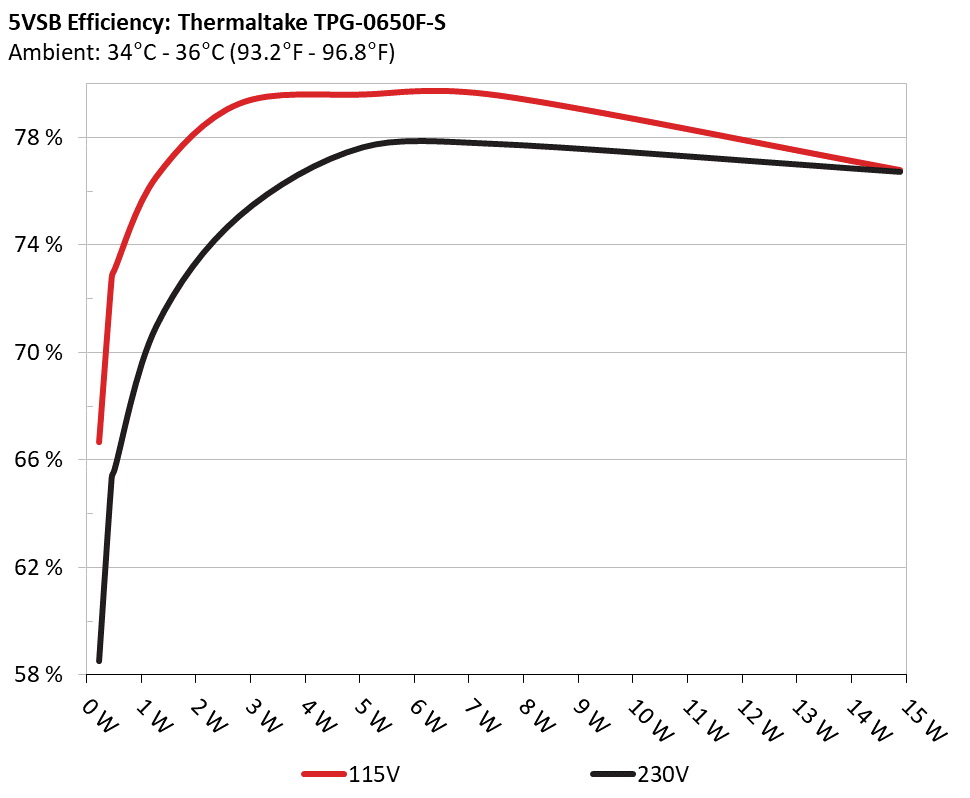 This graph depicts the efficiency levels of the 5VSB rail with 115V and 230V input.