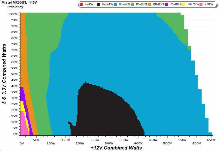 This graph depicts the PSU`s efficiency throughout its entire operational range. For the generation of the efficiency and noise graphs we set our loaders to auto mode through our custom-made software before trying thousands of possible load combinations.