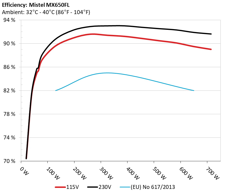 The PSU`s efficiency under high ambient temperatures with 115V and 230V input. For this graph the results of the 10-110% load regulation table are used.