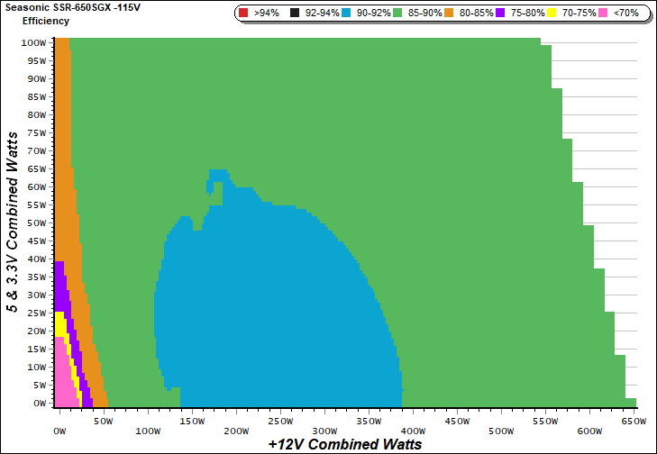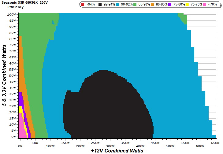 This graph depicts the PSU`s efficiency throughout its entire operational range. For the generation of the efficiency and noise graphs we set our loaders to auto mode through our custom-made software before trying thousands of possible load combinations.