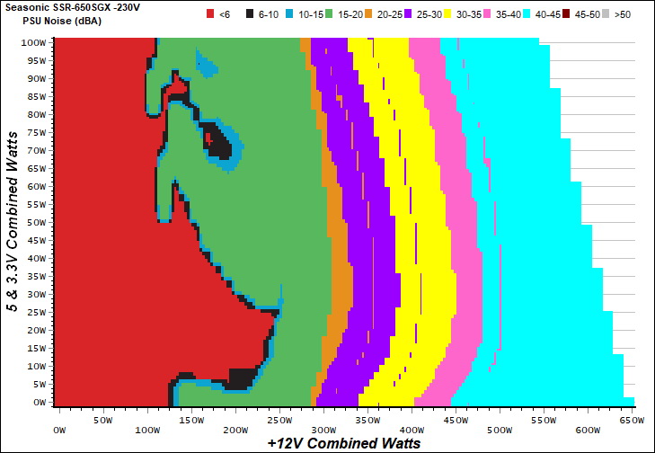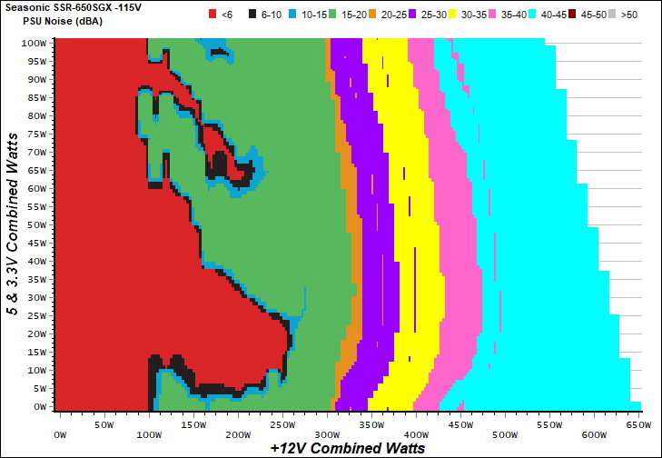 The PSU`s noise in its entire operational range and under 30-32 °C ambient is depicted in this graph. The X axis represents the load on the +12V rail(s) while the Y axis is the load on the minor rails.