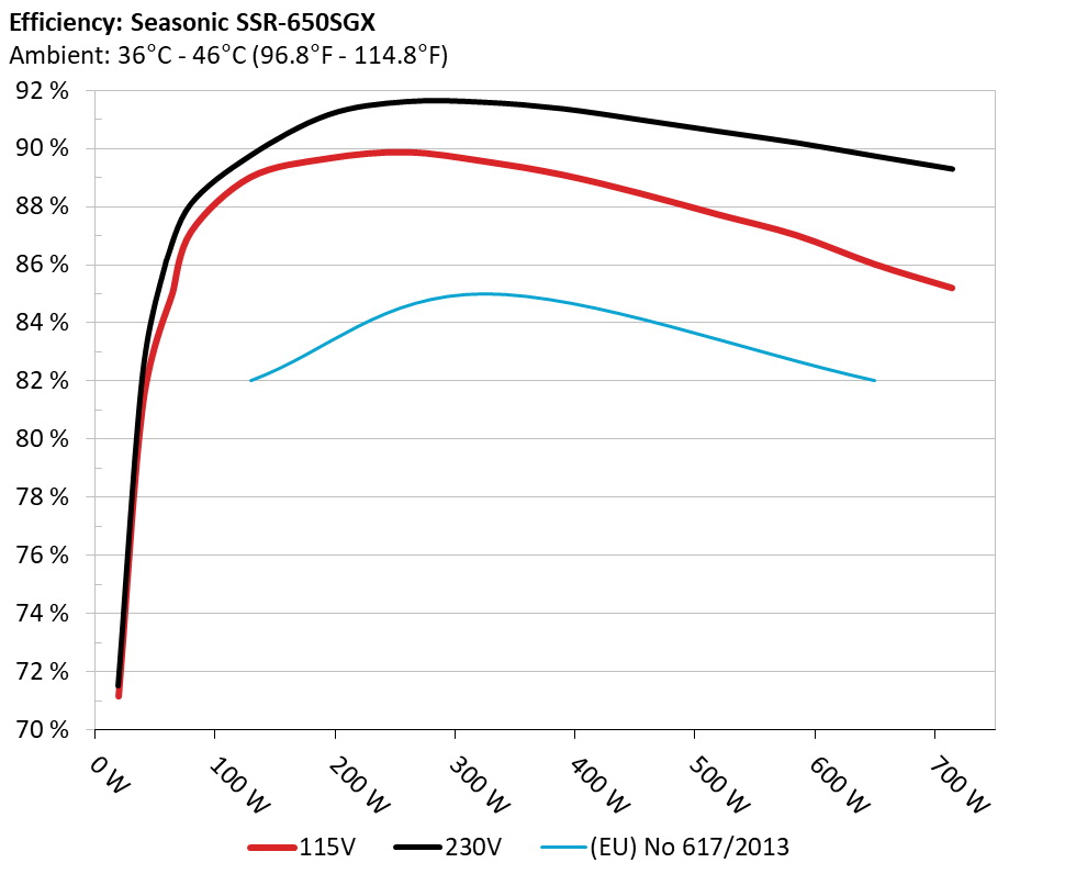 The PSU`s efficiency under high ambient temperatures with 115V and 230V input. For this graph the results of the 10-110% load regulation table are used.