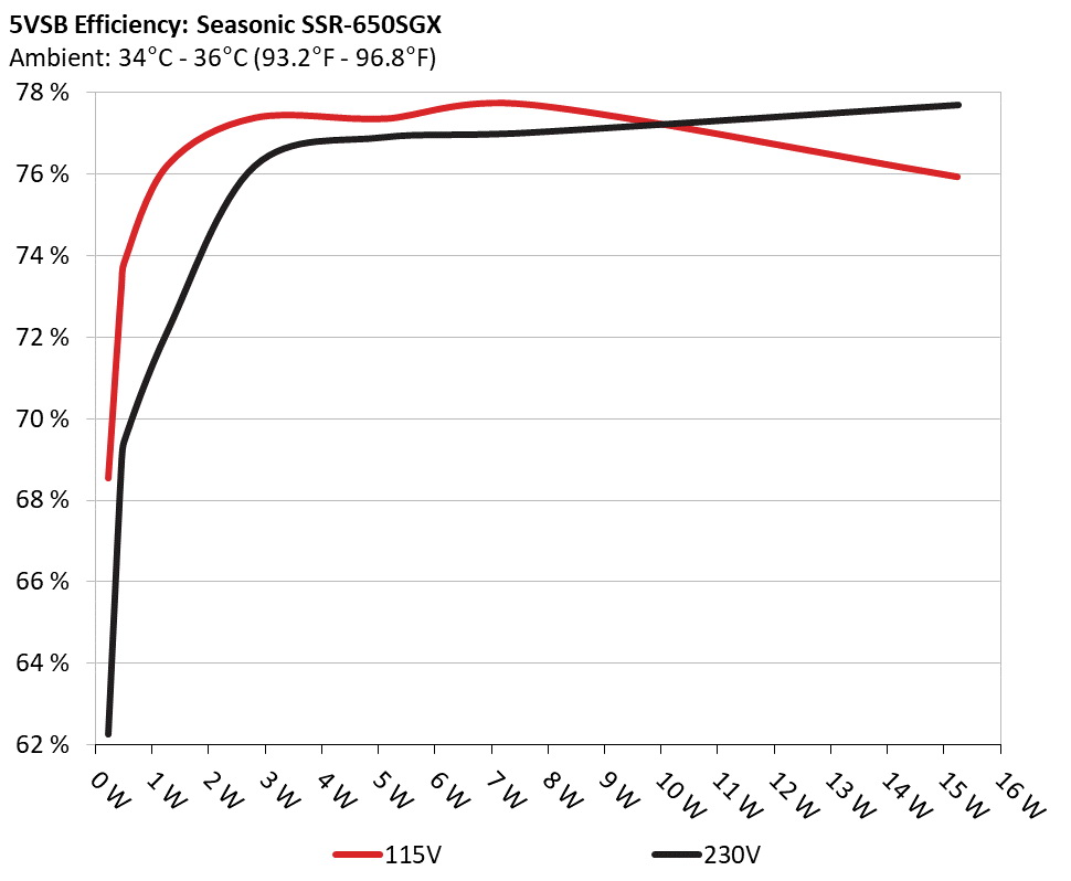 This graph depicts the efficiency levels of the 5VSB rail with 115V and 230V input.