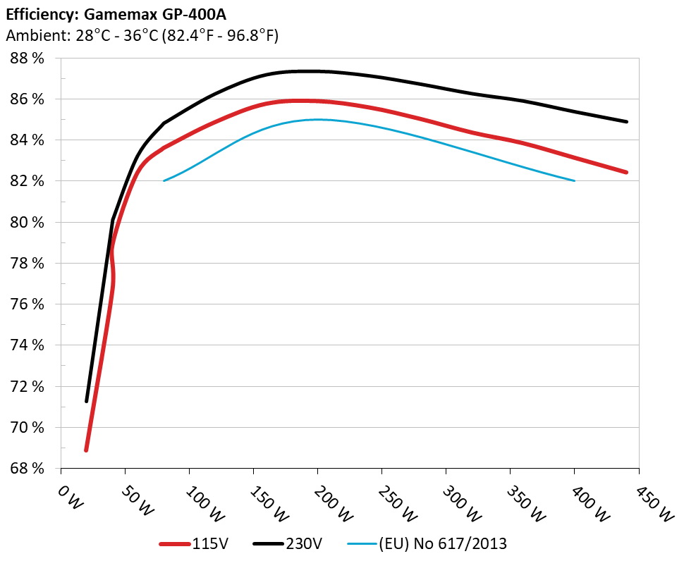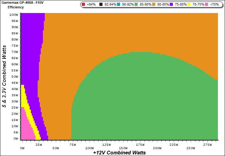This graph depicts the PSU`s efficiency throughout its entire operational range. For the generation of the efficiency and noise graphs we set our loaders to auto mode through our custom-made software before trying thousands of possible load combinations.