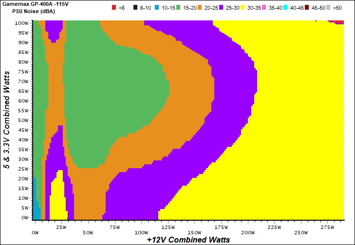 The PSU`s noise in its entire operational range and under 30-32 °C ambient is depicted in this graph. The X axis represents the load on the +12V rail(s) while the Y axis is the load on the minor rails.