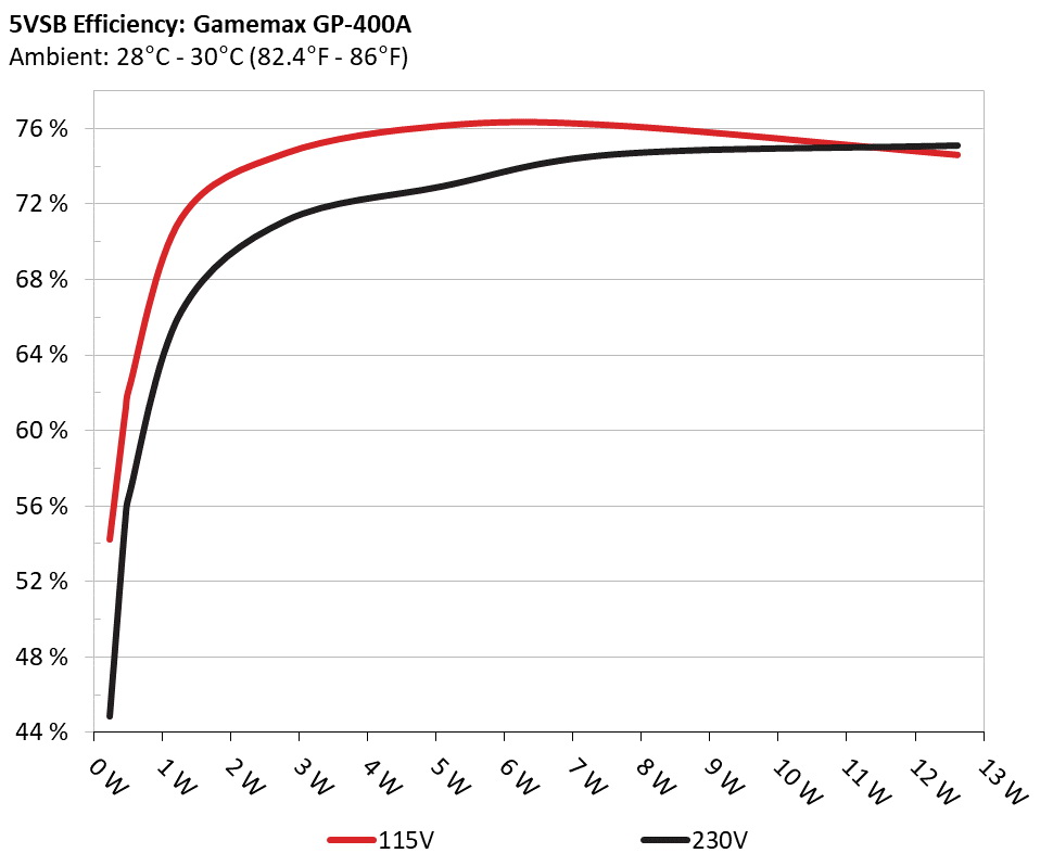 This graph depicts the efficiency levels of the 5VSB rail with 115V and 230V input.