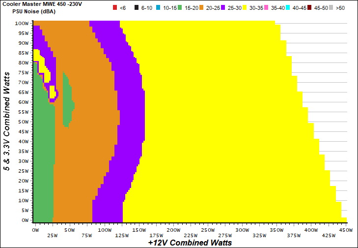 The PSU`s noise in its entire operational range and under 30-32 °C ambient is depicted in this graph. The X axis represents the load on the +12V rail(s) while the Y axis is the load on the minor rails.