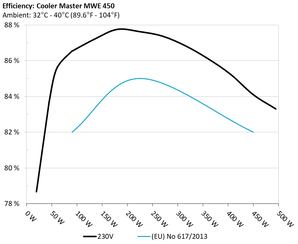 This graph depicts the PSU`s efficiency throughout its entire operational range. For the generation of the efficiency and noise graphs we set our loaders to auto mode through our custom-made software before trying thousands of possible load combinations.