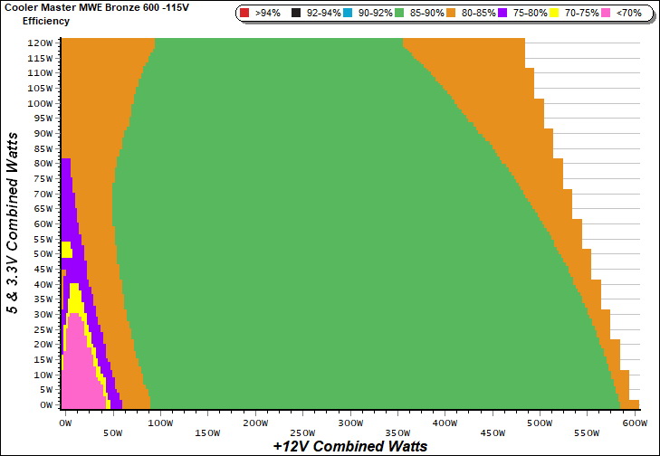 This graph depicts the PSU`s efficiency throughout its entire operational range. For the generation of the efficiency and noise graphs we set our loaders to auto mode through our custom-made software before trying thousands of possible load combinations.