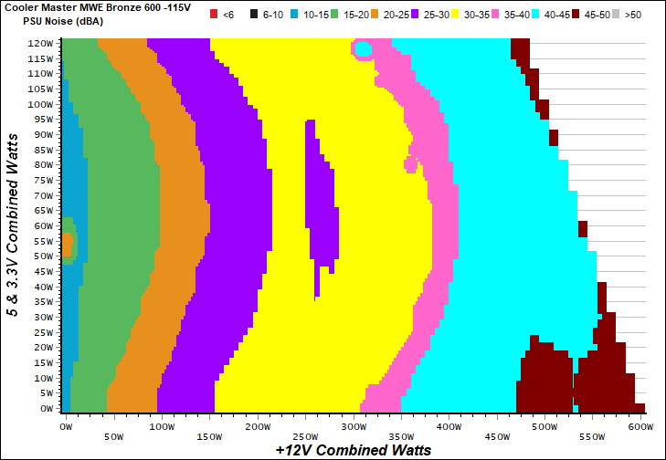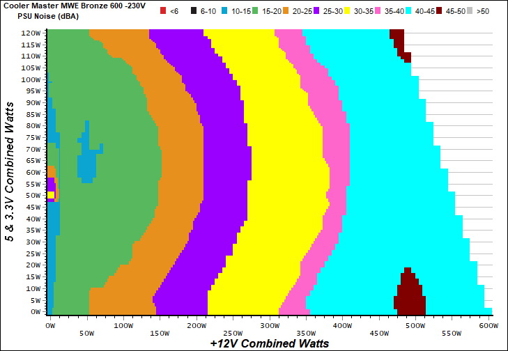 The PSU`s noise in its entire operational range and under 30-32 °C ambient is depicted in this graph. The X axis represents the load on the +12V rail(s) while the Y axis is the load on the minor rails.