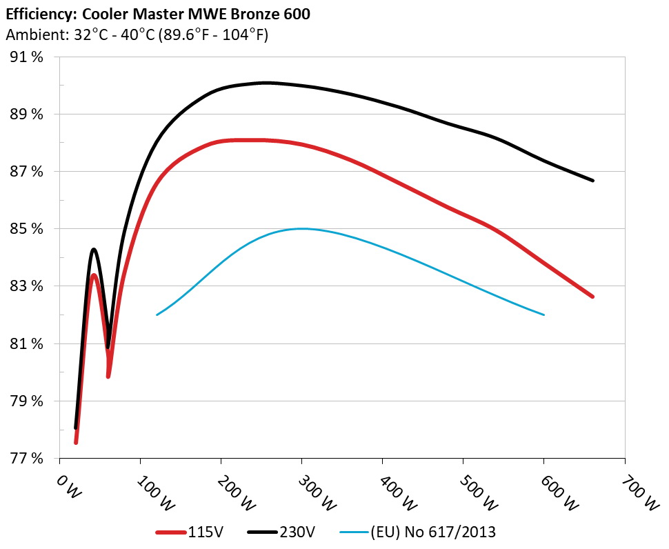 The PSU`s efficiency under high ambient temperatures with 115V and 230V input. For this graph the results of the 10-110% load regulation table are used.