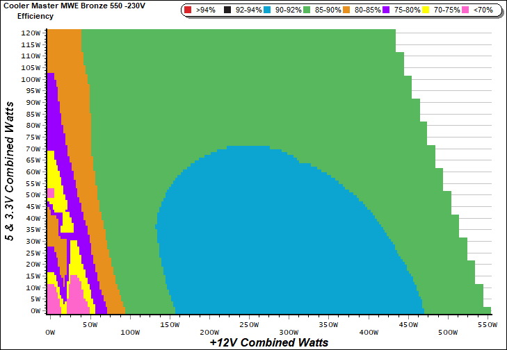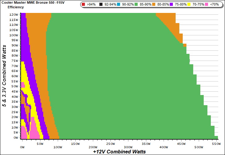 This graph depicts the PSU`s efficiency throughout its entire operational range. For the generation of the efficiency and noise graphs we set our loaders to auto mode through our custom-made software before trying thousands of possible load combinations.