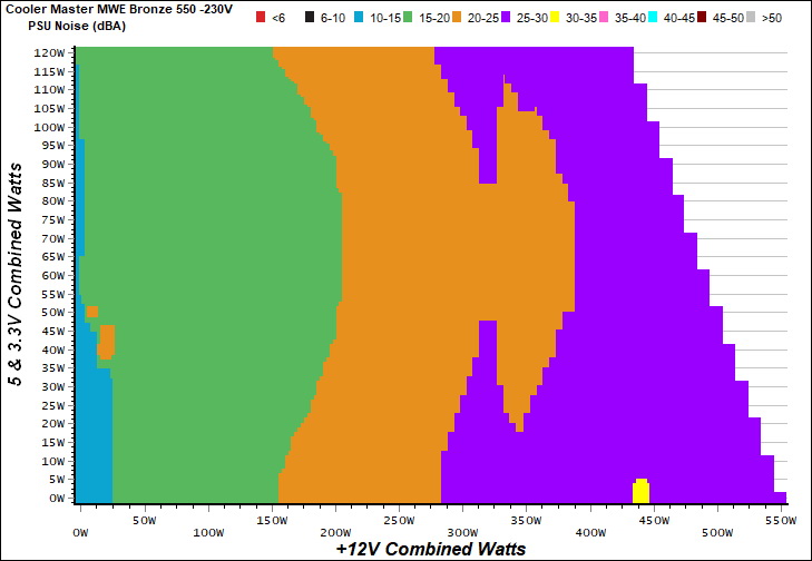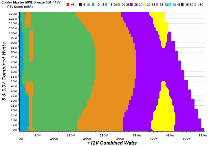 The PSU`s noise in its entire operational range and under 30-32 °C ambient is depicted in this graph. The X axis represents the load on the +12V rail(s) while the Y axis is the load on the minor rails.
