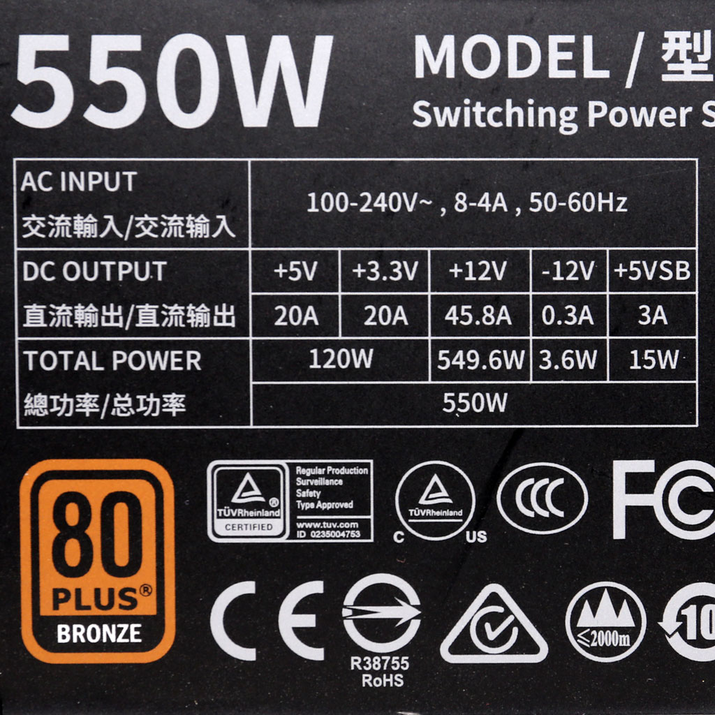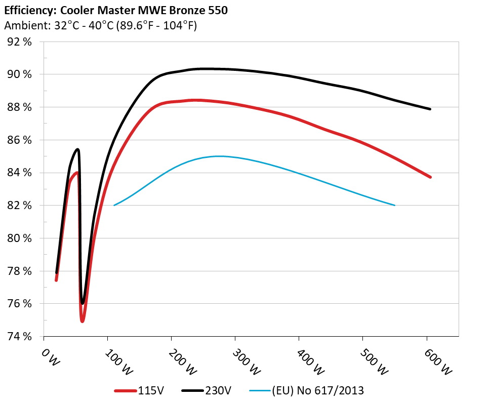 The PSU`s efficiency under high ambient temperatures with 115V and 230V input. For this graph the results of the 10-110% load regulation table are used.