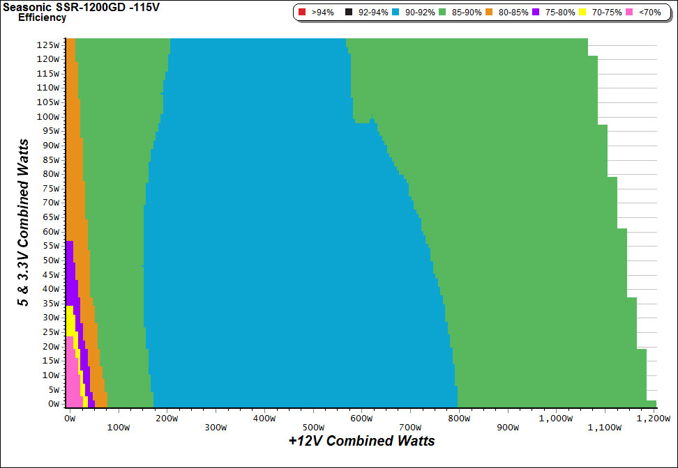 This graph depicts the PSU`s efficiency throughout its entire operational range. For the generation of the efficiency and noise graphs we set our loaders to auto mode through our custom-made software before trying thousands of possible load combinations.