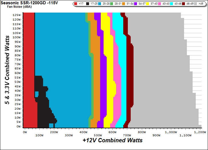 The PSU`s noise in its entire operational range and under 30-32 °C ambient is depicted in this graph. The X axis represents the load on the +12V rail(s) while the Y axis is the load on the minor rails.