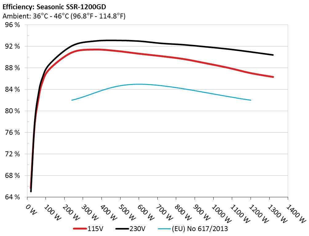 The PSU`s efficiency under high ambient temperatures with 115V and 230V input. For this graph the results of the 10-110% load regulation table are used.