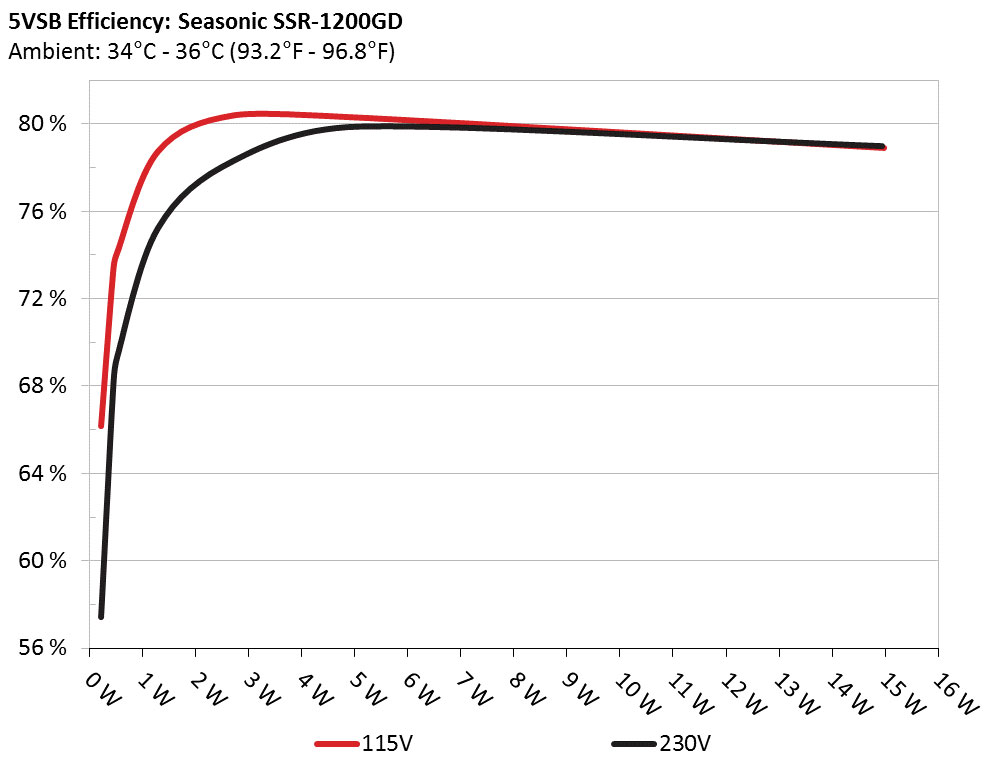 This graph depicts the efficiency levels of the 5VSB rail with 115V and 230V input.