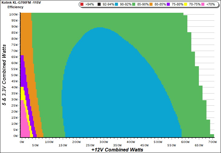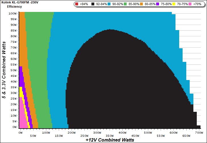 This graph depicts the PSU`s efficiency throughout its entire operational range. For the generation of the efficiency and noise graphs we set our loaders to auto mode through our custom-made software before trying thousands of possible load combinations.