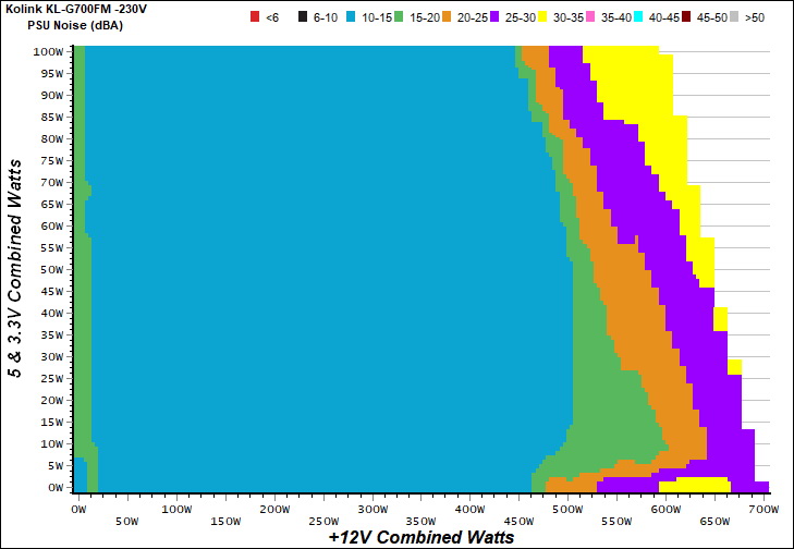 The PSU`s noise in its entire operational range and under 30-32 °C ambient is depicted in this graph. The X axis represents the load on the +12V rail(s) while the Y axis is the load on the minor rails.