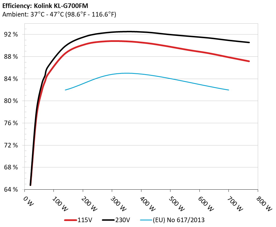 The PSU`s efficiency under high ambient temperatures with 115V and 230V input. For this graph the results of the 10-110% load regulation table are used.