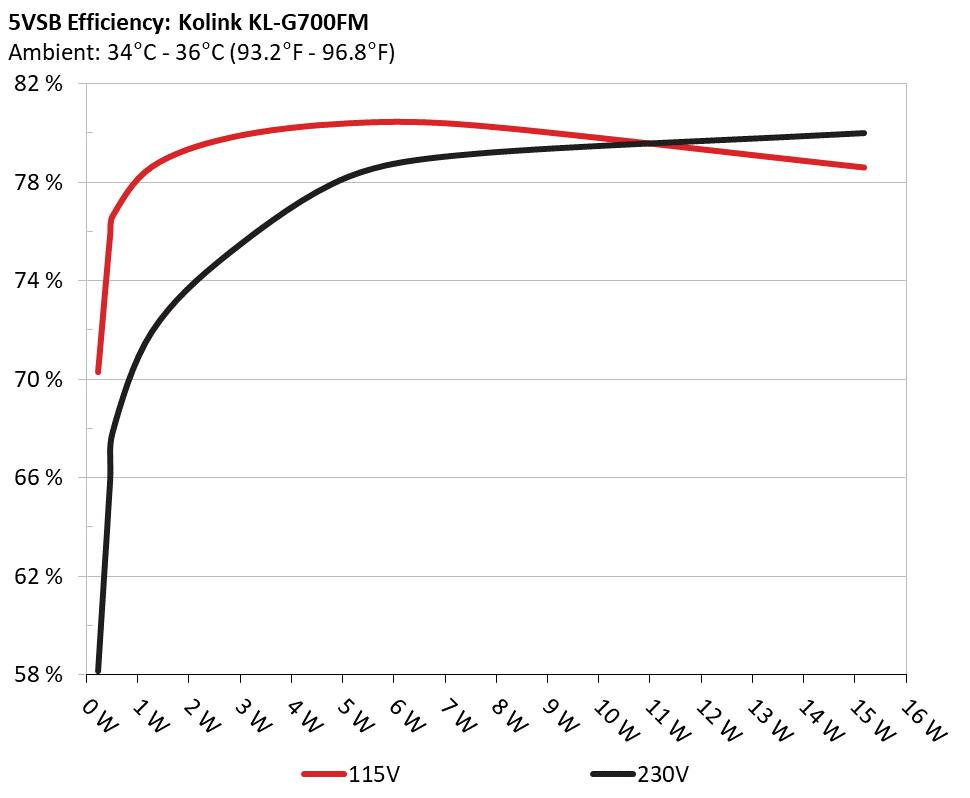 This graph depicts the efficiency levels of the 5VSB rail with 115V and 230V input.