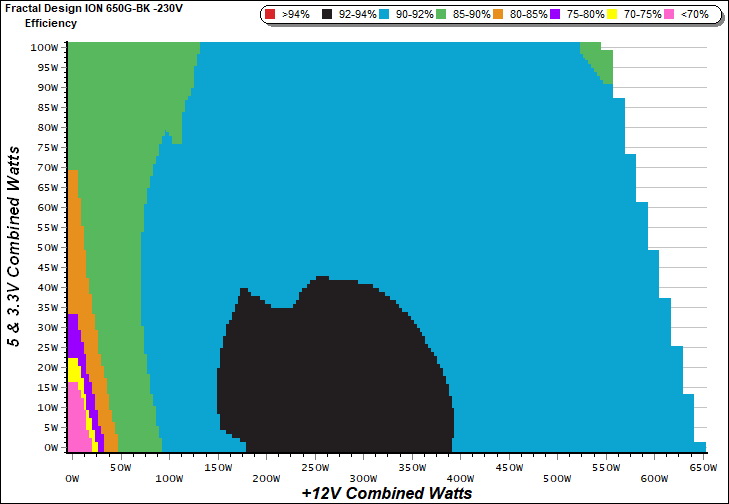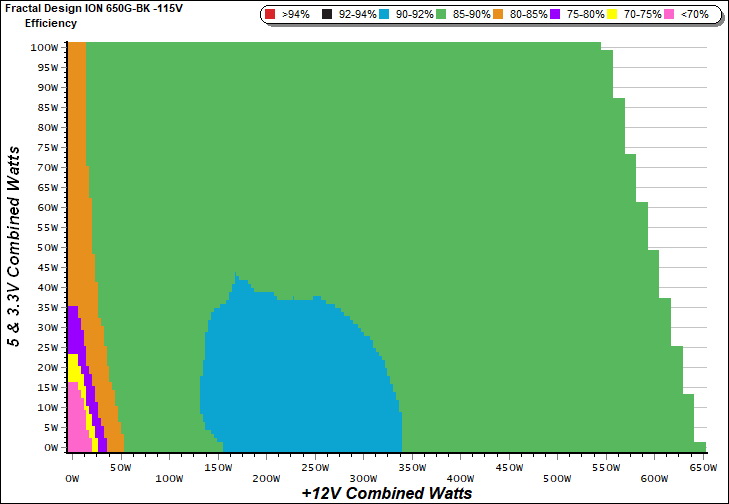 This graph depicts the PSU`s efficiency throughout its entire operational range. For the generation of the efficiency and noise graphs we set our loaders to auto mode through our custom-made software before trying thousands of possible load combinations.
