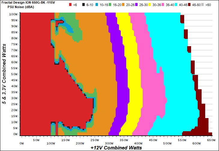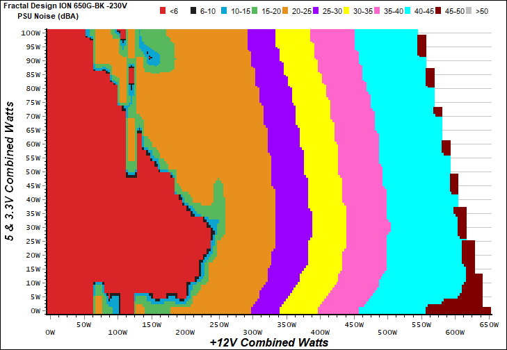 The PSU`s noise in its entire operational range and under 30-32 °C ambient is depicted in this graph. The X axis represents the load on the +12V rail(s) while the Y axis is the load on the minor rails.