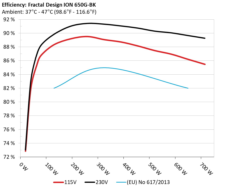 The PSU`s efficiency under high ambient temperatures with 115V and 230V input. For this graph the results of the 10-110% load regulation table are used.