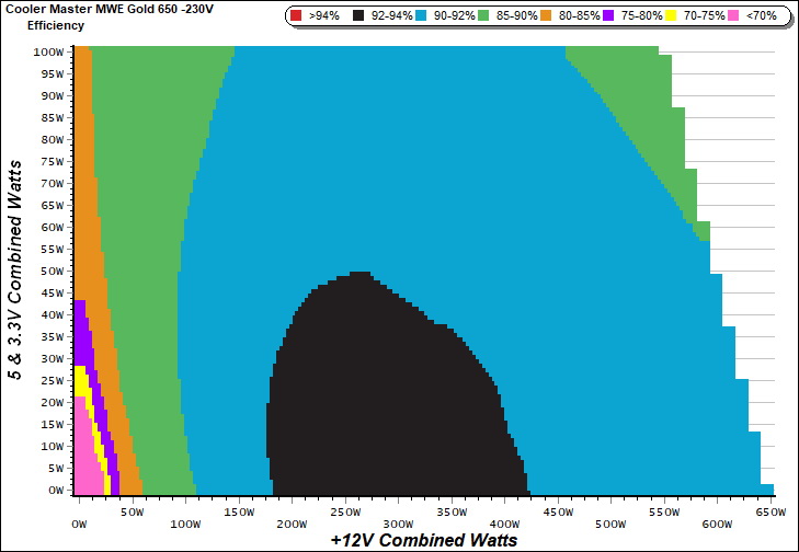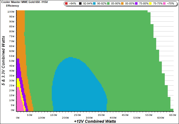 This graph depicts the PSU`s efficiency throughout its entire operational range. For the generation of the efficiency and noise graphs we set our loaders to auto mode through our custom-made software before trying thousands of possible load combinations.