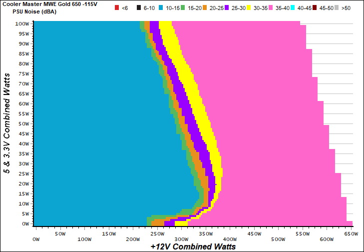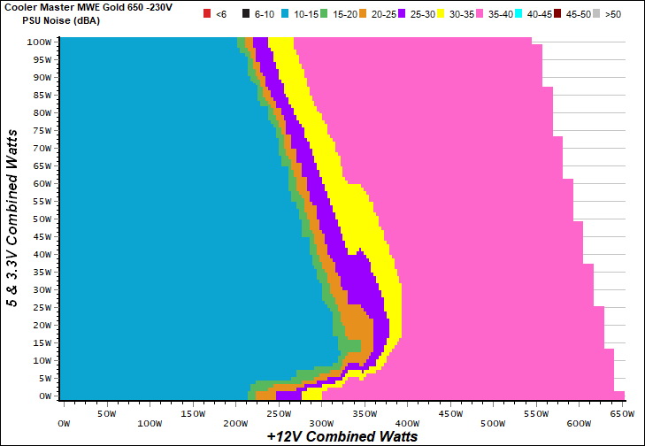 The PSU`s noise in its entire operational range and under 30-32 °C ambient is depicted in this graph. The X axis represents the load on the +12V rail(s) while the Y axis is the load on the minor rails.